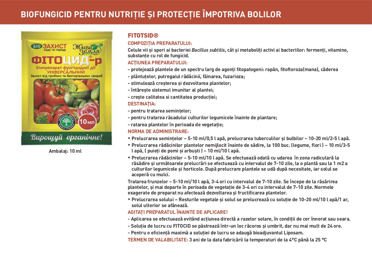 FITOTCIDBiofungicid pentru nutriție și protecție împotriva bolilorCOMPOZIȚIA PREPARATULUI:Celule vii și spori ai bacteriei Bacillus subtilis, cât și metaboliți activi ai bacteriilor: fermenți, vitamine, substanțe cu rol de fungicid.ACȚIUNEA PREPARATULUI:- protejează plantele de un spectru larg de agenți fitopatogeni: rapăn, fitoftoroza(mana), căderea